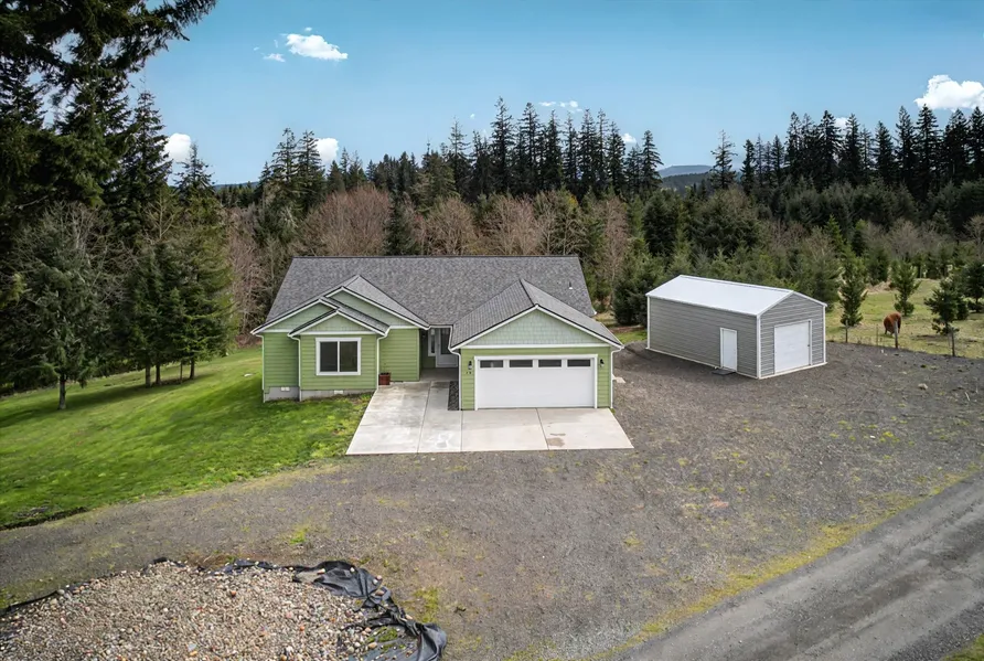 Step into heaven with this stunning home that redefines single story living. Built in 2018, this three-bedroom, two-bathroom retreat boasts extra-wide doors, an expansive 2.57-acre property, and a nice size deck. Inside, discover an airy open floor plan, sleek kitchen with ample counter space, and a dining area perfect for gatherings. An amazing 2021 shop addition offers endless possibilities, and RV parking provides ample space for guests. With its open floor concept, laminate flooring, and vaulted ceilings, this home embodies freedom and possibility. The primary bedroom's walk-in closet and en-suite complete this serene oasis..