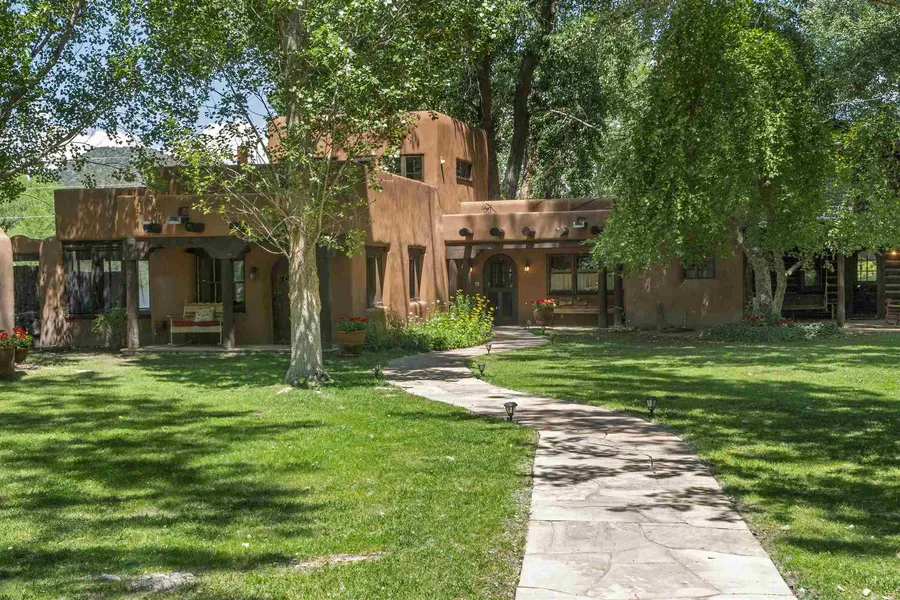 Nestled along the banks of the Rio Grande under ancient trees, with a private beach and wonderful water access; this secluded river paradise is a private oasis from the world. Consisting of a main home designed by Greg Allegretti, an attached old log cabin and a separate studio/office which is ready with plans for a bedroom and bath addition so as to have a detached casita. The main home has an open feel with the living/dining enjoying an incredible river rock kiva fireplace, vigas and beams and French doors opening to the patio and enormous lawn and river vista. The primary bedroom also has a sweet kiva, dressing room and a magical screened sleeping porch for summer sleeps lulled by the rushing river and owls hoots. A loft provides a super office space or guest area. The cool, campy kitchen opens to the main living spaces and also leads into the old log home which also enjoys a wonderful corner kiva of river rock, a cozy bedroom upstairs and sweet views. There are so many architectural details that are lovely and special including lots of old stained glass, coved ceilings, hand make wooden shutters, nichos and vistas to the river and grounds. Great beach areas and river access to enjoy the peace and solitude of Embudo; as well as fabulous water, including two private wells and surface irrigation rights. The property has been used as a venue for private events such as weddings and family reunions, as well as having done very well with vacation renting.