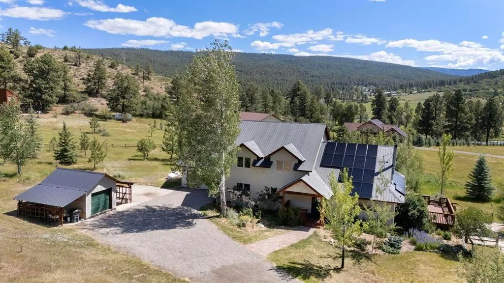 Friendly, walkable location in beautiful Pine River Ranches has something for everyone! Large home on grassy lot with mature landscaping, great barn, storage shed, pet fencing, lofty views, dependable well, has so many uses and amenities. Adjacent lots may possibly be purchased. Spacious Gunnar Andersen designed home has combined comfortable, welcoming spaces and light with practical amenities like rooftop solar array, high efficiency heat pump for heat and AC, infra red heating bars, 2 wood stoves, favorable solar orientation, short term rentals allowed. Energy Star appliances, EV plug-in, RV parking area. Two huge family rooms provide so many choices for use, storage, and enjoyment. Downstairs family room could be re-converted to 2 car garage if desired. Excellent floor plan takes advantage of open pattern, looking out to neighboring pastures, yard, mountain ridges, and river valley. Cross fenced yards, patios and decks provide spaces for entertaining, pets, and gardening projects. Subdivision is well tucked off county road yet extremely accessible to the town and schools of Bayfield and the activities of the lakes and National Forest. Economical HOA. Catch and release Pine River and pond fishing access is afforded to all owners in this peaceful rural neighborhood. Low traffic volume and quiet setting and open space meld the advantages of rural living with modern conveniences. Three bedrooms on main floor are complimented by two huge activity rooms---one upstairs and one down. Upstairs room has bedroom area and downstairs space has adjoining indoor workshop. Kitchen has pantry and plenty of workspace and additional storage. Energy Star appliances, Bosch dishwasher, glass top stove. Dining and living areas are light-filled with passive solar designed for seasonal advantage and beckoning window seat. This well-planned home is ready for your comfort and enjoyment.