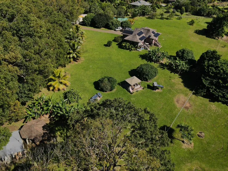 Amazing property, beautiful views. enclosed gazebo, covered large pavilion on treks deck, fire pit. Fully fenced, electronic gate,. Whole home solar with battery back-up, 5 bedroom septic, 30 fruit bearing trees, garden with 2 greenhouses a beautiful, aquaponics pond (koi and peach tilapia set up). An 800 sq. ft. Guest House with full kitchen is allowed, a barn, Ag building, office, shop up to 23,400 sq. ft is allowed, total for the 2 unit CPR. Bee house, open floor plan to kitchen, dining room, living room with vaulted ceiling, primary suite with vaulted ceiling, walk-in closet, large walk-in pantry and laundry area off kitchen. Hardwood floors, Granite counter tops, kitchen, bathrooms have slate tiled floors, showers. Pictures reflect 2nd bedroom with removable floating wall for 2 childrens seperate rooms. Large tent with exercise equipment negotiable. Makaleha Mountain Range, stream and pond views. Fruit trees: apple bananas, William bananas, 7 dwarf coconuts, Longan, Rolina, Noni, 2 mango, lemon, 2 lime, 6 orange, 3 avocado , 5 lychee, mountain apple, egg fruit, jack fruit, soursop, grapefruit, papaya, lilikoi, dragon fruit, miracle berry, mulberry, clementine, blackberry, watercress, mint. Will sell furnished-negotiable. Virtual Tour on icon above !
