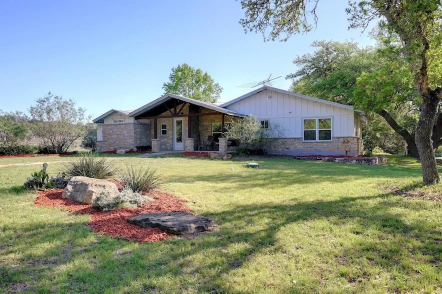 Escape to your own private sanctuary on 2.64 acres, just 5 minutes from Canyon Lake beach, park, and marina. Welcome to 842 Cougar Drive, a fully furnished, charming property that offers a blend of comfort and functionality with 3 spacious bedrooms and 3 full baths. The luxurious primary suite is a true retreat, featuring a wood-slatted, vaulted ceiling that adds warmth and character. Unwind in the spa-like ensuite bath, complete with a walk-in shower, soaking tub, and a large walk-in closet with ample space for additional storage. The heart of the property lies in its incredible outdoor living spaces: soak in the hot tub under the stars, cool off in the stock tank pool, or gather around the stone pizza oven for unforgettable evenings with friends and family. Multiple seating areas shaded by magnificent live oaks invite you to relax and take in the sweeping pastoral views. For hobbyists or those in need of extra storage, the large metal detached garage doubles as a versatile workshop. Whether you're seeking a weekend getaway or a full-time residence, this home offers the best of Hill Country living: peace, privacy, and proximity to it all.