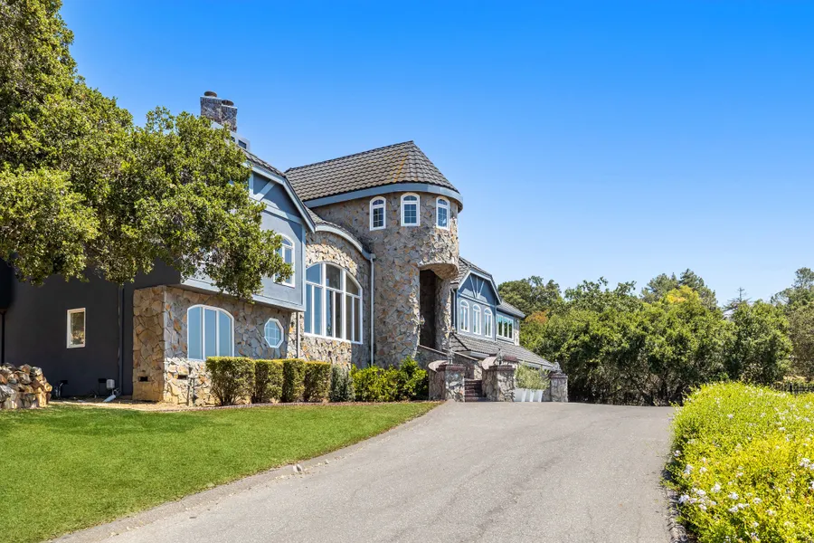 This grand, captivating home embodies a Chateauesque style architecture with all the essential elements and mesmerizes with panoramic vistas. Natural light floods the towering interior from large encased windows in the formal sitting/living and dining rooms. The eat-in chef's kitchen is the heart of the home with its warm-hued colors and access to a huge patio deck for outdoor entertaining. Cool nights beckon you inside to the French chalet inspired family room with fireplace and french doors to the enclosed veranda with wrap around windows. This custom tri-level home is designed to accommodate multi-gen family and guests, while refined elegance adorns the primary bedroom suite for the utltimate sanctuary. Optimally located for privacy is the office for ease of attending to business. Host amazing soriees in the game/party room and venture outdoors for fun in the sun around the solar heated pool and sports court. Four car oversized finished garage with plenty of onsite parking. Eco-friendly solar panels for low electricity bills. The County has approved the preliminary review for a SB9 parcel split for folks interested in future income potential. Excellent rated Graystone Elementary, Bret Harte Middle, and Leland High schools (buyer to verify enrollment.)