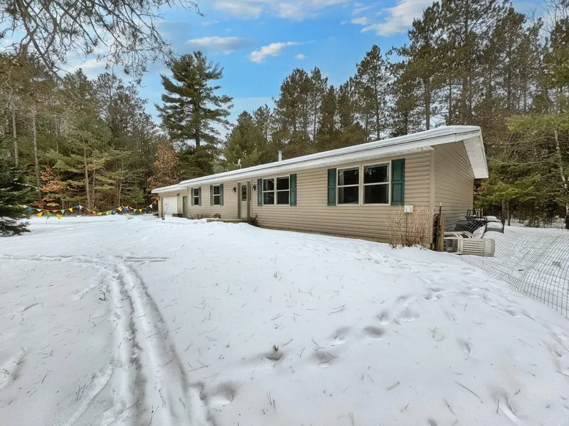 Nestled on 2.67 acres, this charming 3-bedroom, 2.5-bathroom ranch home is perfect for those who crave the serenity of rural living. As you step inside, you'll be greeted by a cozy living room w/ a gas fireplace, & vaulted ceiling, adjoining the dining room & kitchen, making it easy to entertain. Retreat to the master bedroom, featuring a master closet & en-suite bathroom with double sinks, whirlpool tub & water closet w/ shower. The full-size basement has an additional living/rec. space to enjoy a rock-climbing wall, bonus room, half bath & shop room that connects to the attached 2+ car garage for added convenience. With state land surrounding you & the river just a stone’s throw away, you’ll love the easy access to trails right from your backyard. Blueberry, raspberry and grape bushes waiting for you to enjoy in the warmer months. Direct access to snowmobile, biking trails ATV/UTV trails, and is near public hunting land & many boat landings. Hot tub included! Check out for yourself!