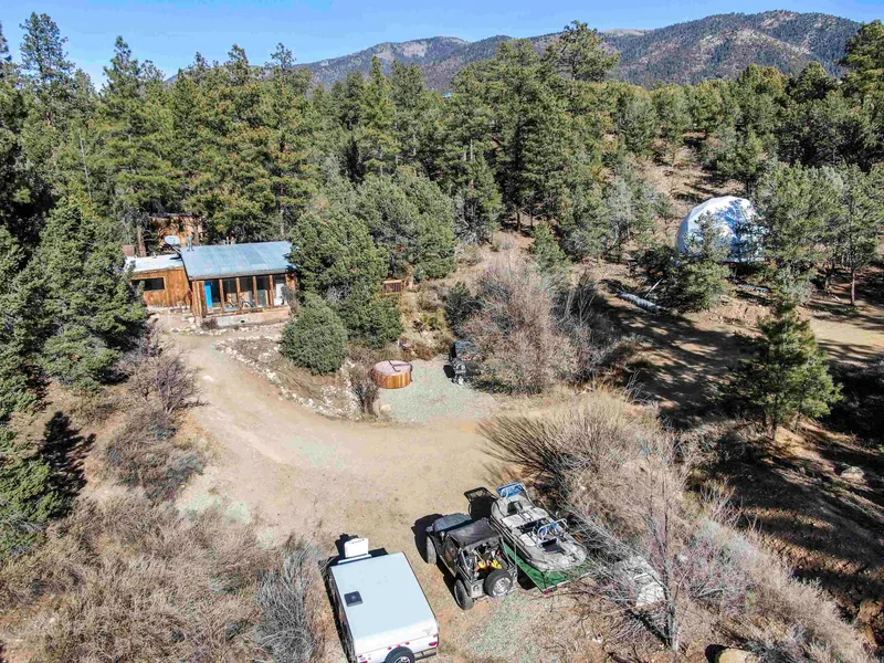 Mountain Living in Gallina Canyon - Valdez, NM. Nestled in the serene beauty of Valdez, amongst the old growth trees. This three-bedroom, two-bath home offers the perfect blend of rustic charm and modern comfort. Situated in the sought-after Gallina Canyon, the property boasts privacy, peaceful surroundings, and endless possibilities for outdoor adventure. The main house features a thoughtful design with a cozy gas-stove, wood ceilings and floors. An open kitchen and new butcher block counters in this Gallina gem. The kitchen is equipped with updated appliances and a porch off the main living area. Below the porch in the spacious yard is a well maintained hot tub. Perfect for soaking in the evening after long ski days! Fiber internet to the house is great in the mountainous area. Adding to its allure, the property includes a unique and fully-functional geodesic dome auxiliary unit. Perfect as a rental, guest quarters, or creative studio, this eco-friendly space is sure to impress. With its own private entrance, kitchen, and bathroom, it offers an incredible income opportunity or a one-of-a-kind retreat for visitors. The 2.69 -acre lot also includes diverse trees, and access to hiking and mountain biking trails. Located just just 11 miles from Taos Ski Valley, this property offers the ultimate in tranquility while remaining convenient to all the areas amenities. Whether youre looking for a peaceful home, an investment opportunity, or ski cabin, this is a Gallina Canyon gem. Key Features: 3 bedrooms, 2 baths in main house & Hot tub. Geodesic dome rental/auxiliary unit with kitchenette and bath Close proximity to Taos and Taos Ski Valley