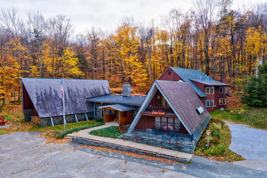 Mid-century modern design, this Multiple A-Frame property is nestled just off the Killington Road, directly across from the World Famous Wobbly Barn and only 1 mile from Killington Ski, Bike & Golf Resort. Originally built as a single family home in 1965, the property was enlarged and converted into a 10 room inn and restaurant by the current owners in 1997. For the past 24 years, it has operated as a successful business and primary residence for the innkeepers. One A-frame features exposed timbers and slate walls in the Great Room Bar and Lounge with a stunning wood fireplace. The second A-Frame hosts a slate floor Dining Room, commercial kitchen and a private lofted space for an office or private lounge. Gorgeous sun and shade gardens surround the 2.7 acre property. A generously sized Master Apartment Suite with lofted bedroom features a cathedral ceiling, kitchen and a private patio w...