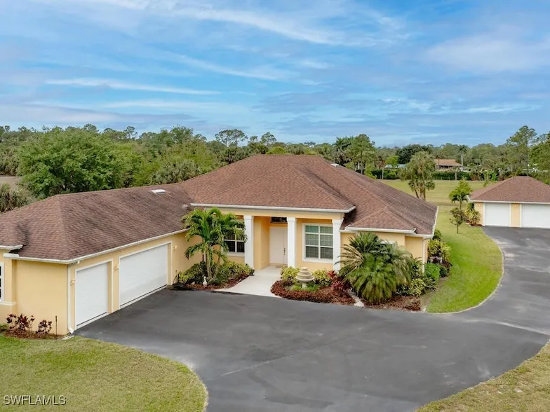Discover luxury living in the serene beauty of Golden Gate Estates with this exceptional home, perfectly situated on 2.73 acres of 100% uplands. Offering both privacy and tranquility, this residence boasts sweeping views of the surrounding countryside. Designed for comfort and convenience, the home features a spacious open kitchen with stainless steel appliances, quartz countertops, and ample storage. Two expansive master suites provide ultimate relaxation, with the primary suite offering two walk-in closets, granite countertops, and a deep soaker tub. Modern amenities enhance the home's appeal, including whole-house solar power, an attached three-car garage with epoxy floor, and an extended-length three-car detached garage. Additional features include a buried 250 gallon propane tank that powers the tankless water heater, whole-house reverse osmosis system, custom screens in the foyer and detached garage, wired generator power, two HVAC systems, irrigation system, impact-resistant windows and sliders, security system, and skylights. The room off the garage is framed for a window, and the primary master bedroom is framed for a door, offering additional customization potential. Surrounded by nature, the property also boasts numerous fruit trees and a large garden. Despite its peaceful setting, this home is just a short drive from downtown Naples, where you can enjoy world-class dining, upscale shopping, cultural attractions, and pristine beaches. Experience the perfect blend of luxury, privacy, and convenience in this extraordinary Golden Gate Estates home!