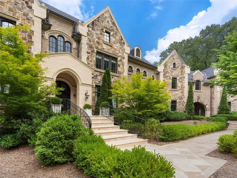 Spectacular custom English Manor home in coveted Winterthur Estates in Sandy Springs at the end of a cul de sac on 2.78 acres. Stone and brick exterior. New architectural roof added in 2020. Just 10 minutes north of Buckhead, Winterthur Estates is a best kept secret on the Chattahoochee River. Includes tennis and basketball courts. Exceptional open living environment with a massive kitchen, family room with a vaulted ceiling and kitchen with 12-35 foot ceilings and a double marble island, Wolf and Sub Zero, catering kitchen, huge walk in pantry and breakfast room. There are 7 fireplaces, 5 on the main level. Spectacular owners suite on main with sitting room and fireplace, doors out to covered loggia, dual dressing rooms, marble and stone bath. Dramatic two story library with fireplace across from the dining room. Each secondary bedroom is a suite upstairs. Covered outdoor Viking kitchen...