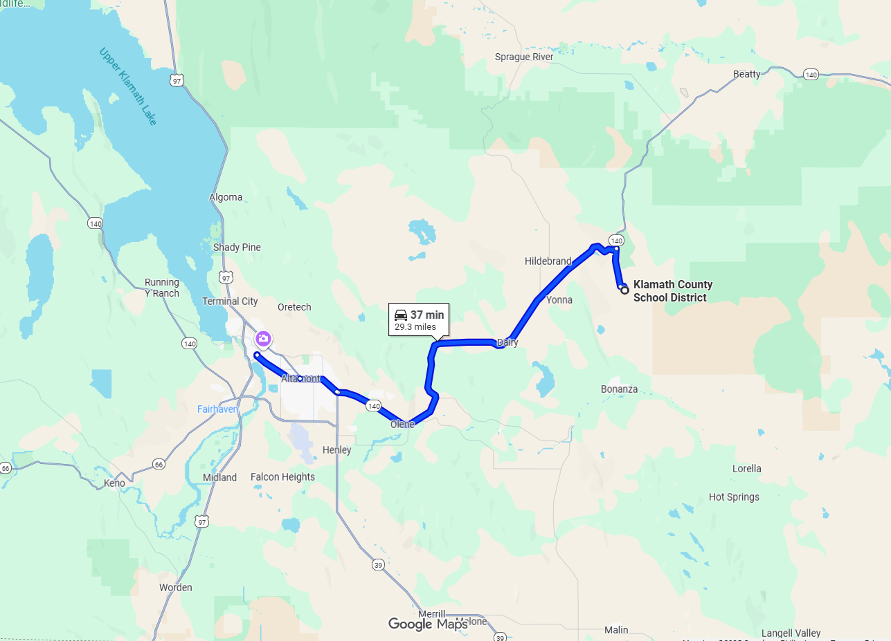 Klamath Falls, OR: ~29 miles larger city with shopping, healthcare, and more