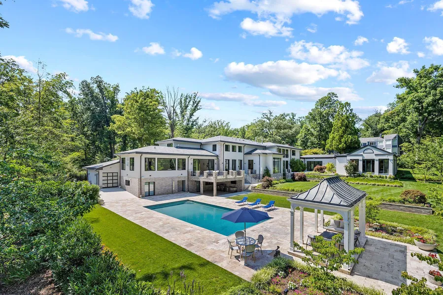 Prominently positioned yet discreetly tucked away on a quiet, winding section of famed Fernwood Road in legendary Bradley Hills Grove, this is one of those truly special homes where not a single detail has been overlooked. Painstakingly reinvented with obsessive attention to detail and the finest international materials, all 15,000 square feet of living space has undergone a complete transformation the result of which is an estate with an old soul clad in contemporary finishes. The driveway, with its intricately inlaid criss-crosses of grass, evokes a distinctly Californian charm conveying a sense of airiness carried throughout the home. Light floods the 19 foot greeting hall and gives way to a stunning open-slab glass staircase whose transparency allows light from the double-height wall of windows beyond to permeate inwards. Fine workmanship and top-notch materials are evident everywhere, an example of which can be seen with custom built imported interior doors. Elegantly proportioned formal spaces live up to the substantial square footage, enabling entertaining on the grandest of scales. Yet, the thoughtfully designed floor plan is equally apt at accommodating everyday living. As the heart of the informal space, the chefs kitchen boasts an oversized quartz-topped center island and two large windows letting in abundant natural light. Sleek European style cabinetry conceals a full suite of top-of-the-line Miele appliances, including a 48-inch commercial range and twin wall ovens. A large primary suite completes the main level, facilitating multigenerational living. Reaching the upper level via stairs or one of two elevators, the second primary suite, with its raised ceiling, has three sets of French doors which reveal sweeping views of the rear garden and pool. Its spa-inspired bath features twin floating vanities, a freestanding tub, a walk-in shower concealed by custom smoked-glass doors, and, along with every other bathroom in the home, radiant heated floors. The custom dressing room is equally minimalist with dark mirrored doors concealing all shelving and a large center island. Amenity-rich, the estate boasts a fully-equipped covered outdoor kitchen with Wolf appliances, as well as an extensive stone terrace. The terrace steps down to an immaculate patio housing the newly resurfaced outdoor pool with automatic retracting cover and a charming gazebo beyond. The indoor swimming pavilion, gym, hammam, and steam room affords year-round usability. Back outside, manicured lawns extend into the treeline, which creates a canopy of privacy along all 2.77 acres of space a hardly believable acreage for close-in Bethesda. Built like a fortress from concrete and steel, commercial grade systems work behind the scenes to run the estate, not limited to twin generators, a new roof, new sprinkler system, new contemporary garage doors, no less than eight HVAC units, and a comprehensive audio/visual system encompassing surround sound as well as security video surveillance. Unparalleled in design and execution, 8801 Fernwood Road is premium in every square inch. Combined with its rare large lot in an incomparable location blending privacy and accessibility, this is a home for the most discerning buyer and undoubtedly one of Bethesdas great estates.