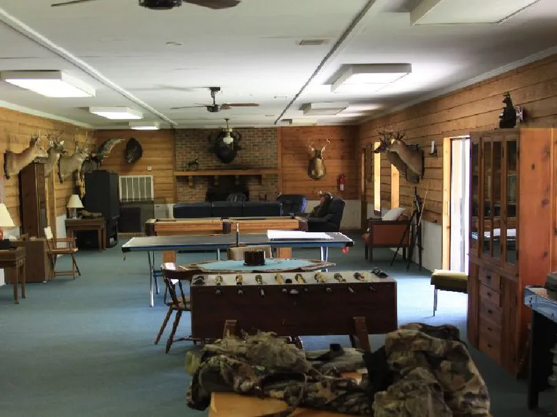 This close-knit group enjoys their comforts when away from work. The well-apportioned hunting cabin features 5 bedrooms, a fully equipped kitchen, fireplace, satellite TV, and great room, all with central heat and air conditioning. There is plenty of storage for each member's ATVs, boats, and other "toys." A skinning shed and walk-in cooler sits adjacent to the house and four-wheeler shed and across from the target shooting range.