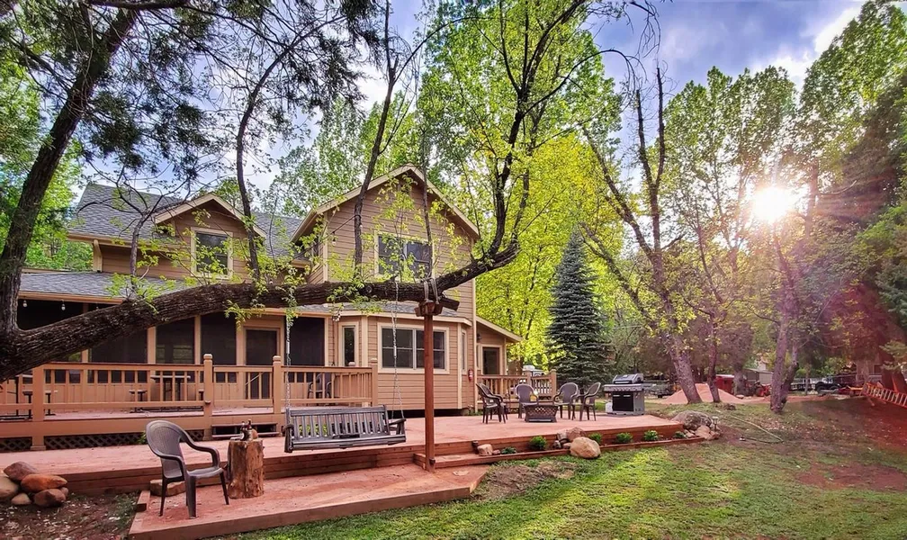 Set on approximately 2.82 acres along the banks of the East Verde River, this unique riverfront property offers a rare combination of privacy, flexibility, and year-round enjoyment. With Tonto National Forest just across the road and private river frontage on site, the setting is both peaceful and adventure-ready. The property includes two separate residences, each offering a distinct living experience. The river-adjacent home features approximately 2,080 sq ft with 5 bedrooms and 2 bathrooms, including two upstairs primary bedrooms and three additional bedrooms on the main level. Recent updates include a new roof and updated appliances. River views can be enjoyed from the screened porch and open deck, while a pellet stove provides efficient supplemental heat alongside central HVAC. The second residence offers approximately 1,440 sq ft with 2 bedrooms and 2 bathrooms and is designed around a great-room floor plan. The primary bedroom includes an en-suite bath with shower, while a second full bath with tub/shower is located off the hallway. Features include radiant floor heating, a custom stone fireplace with pellet stove insert, a durable metal roof, and an attached one-car garage with interior access through the utility room. Multiple decks and outdoor living areas extend the living space and make this home ideal for gathering and entertaining. Outdoor features include expansive manicured lawn areas, mature trees, multiple seating and firepit areas, and direct river access for fishing and relaxation. Additional improvements include storage sheds, a gated entry with keypad access, a detached office or studio space near the entrance, and a newer auxiliary structure designed for fitness, studio, or creative use, ready for completion to the next owner's vision. Whether envisioned as a private retreat, multi-generational estate, or a one-of-a-kind lifestyle property, this riverfront offering presents exceptional opportunity in a truly special setting.