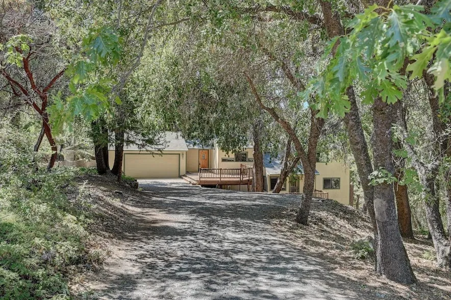 Enchanting 2.84-Acre Retreat with Custom Split-Level Home. Nestled amidst towering pines and majestic oak trees, this 2.84-acre property offers a serene escape with a beautifully designed split-level home that showcases both artistic craftsmanship and energy efficiency. The home features heart redwood ceilings and trim, hand-textured drywall, custom doors, and strategically placed skylights, all demonstrating exceptional attention to detail. With 3 spacious bedrooms, a den, and 2 well-appointed bathrooms, there's ample room for everyone to enjoy. Multiple decks provide the perfect vantage points to soak in the privacy and breathtaking views of the surrounding natural beauty. The expansive, usable acreage offers endless possibilitieswhether for adding additional structures, keeping animals, or simply enjoying the tranquility of your own private sanctuary. Conveniently located on a paved county road, this property represents an incredible value for those seeking a harmonious blend of design, function, and nature.