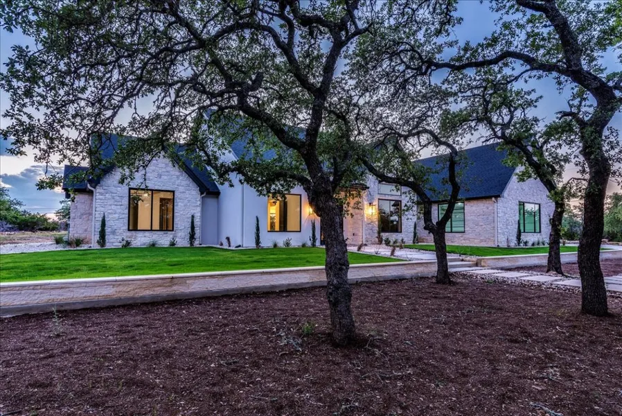 New Construction - Custom Single-Story Estate This beautifully designed custom home spans over 2,900 sq. ft. and sits on a serene 2.89-acre lot surrounded by mature trees. Showcasing the El Dorado "Casa Blanca" style, the exterior features a striking blend of rough-cut stone and hand-troweled stucco in soft neutral tones, accented by bold black trim. A stunning 61" x 81" pivot steel and glass front door sets the tone for the refined interiors. Inside, soaring ceilings and white oak flooring create a warm, inviting atmosphere. The main living area impresses with 17' ceilings, custom Alder wood beams, a tongue-and-groove ceiling, and a dramatic 72" black porcelain fireplace wall. Expansive windows flood the space with natural light, while sliding glass doors open to a covered patio with tile flooring, a large ceiling fan, and an extended concrete patio featuring an 8-foot stone fireplace-i...