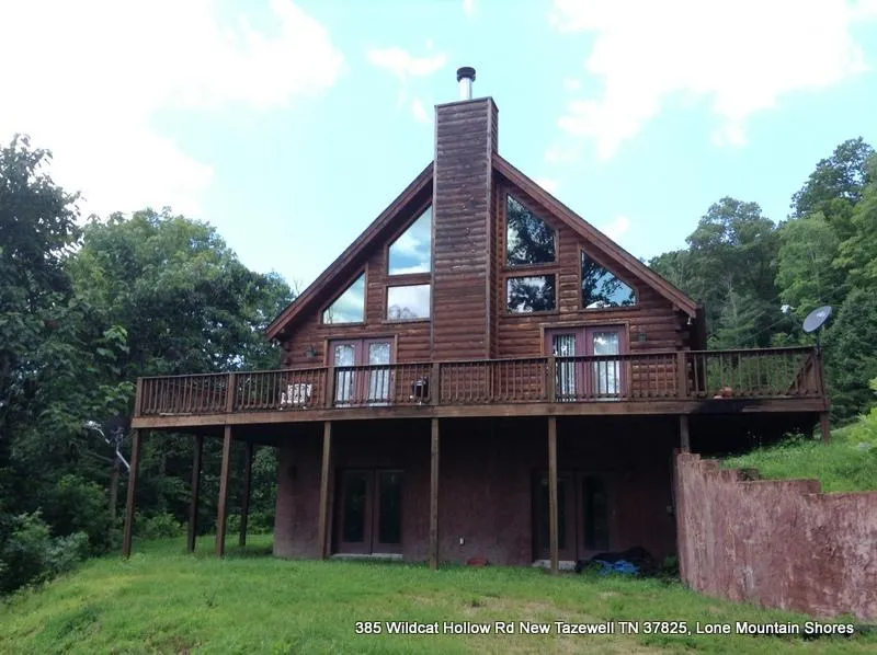 East Tennessee Waterfront: In the mountains overlooking Norris Lake in Claiborne County Tennessee in the secluded lake front subdivision of Lone Mountain Shores. Sitting on 2.89 acres is this A-frame Log home with full basement, pine tongue-and-groove ceiling, open fireplace, hardwood flooring, and master suite with Jacuzzi tub in upper loft with balcony. This three-bedroom, three-bath home with open floor plan and cathedral ceiling is accompanied with wrap-around deck overlooking Norris Lake and the East Tennessee mountains. Enjoy Norris Lake, the amenities of the dock, boat launch, and clubhouse on Lone Mountain Shores along with the amenities that Tennessee, Virginia, and Kentucky have to offer. 249,900.00