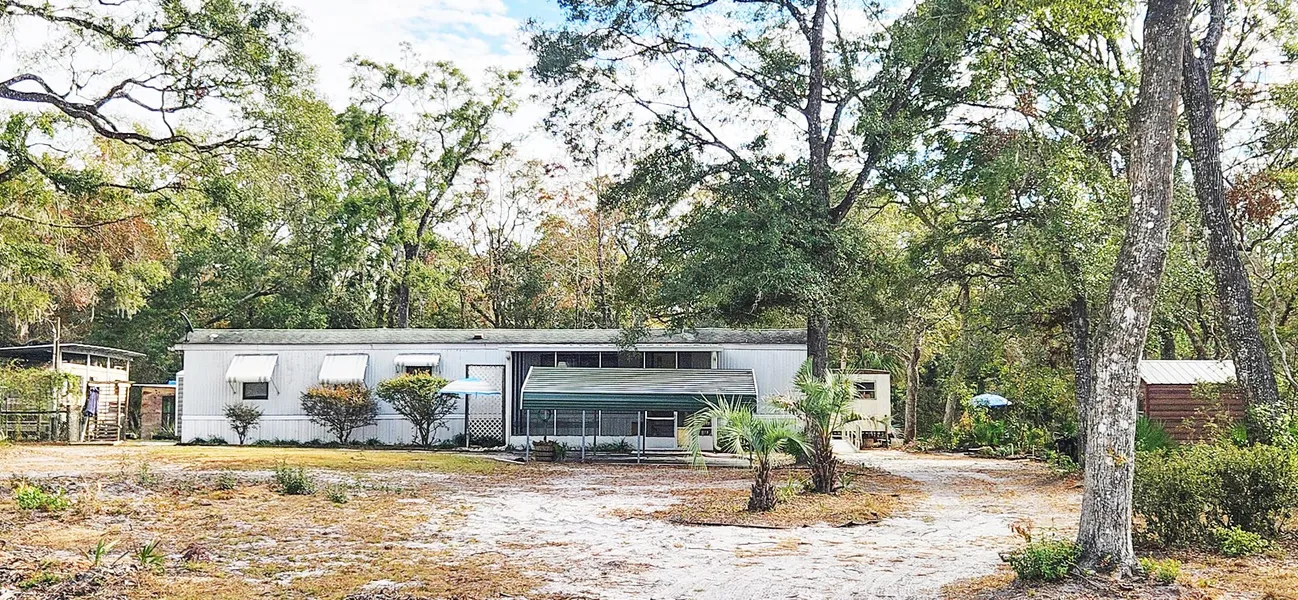 2/2 Split Plan on 2.89 Acres Move In Ready Screened Front Porch, Covered Back Deck Handicap Ramp, 2 Car Detached Carport. Fiber Optic Internet, Tons of Storage Multiple Sheds with Power. 34' RV Included. Fully Fenced & Just Off Paved Road. Can be Financed by FHA