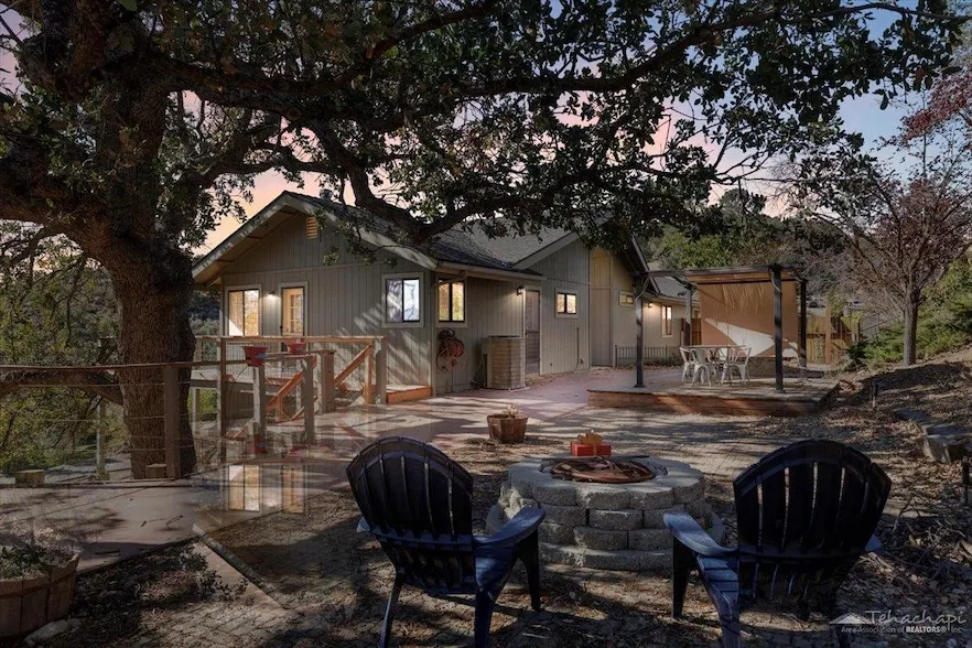 Located in Bear Valley Springs a gated community. The main level has Living room with a fireplace and a large built-in hutch. Dining area is large and has lots of light from the windows. Kitchen has granite counters and tile backsplash with lots of cabinets for storage and a pantry. The laundry is off the kitchen and has lots of cabinets and storage area. There are 2 bedrooms upstairs; the guest room has a Murphy bed with storage cabinets. The Primary bedroom has a large built-in cabinet and wood type flooring with the same beautiful views. Primary bath has a shower and a nice size granite counter vanity. The downstairs can be accessed from outside and has its own entrance. Downstairs is a room/office with another 3/4 Bathroom and large den plus a huge walk-in closet off the hallway. The deck has been redone and has a large oak tree plus amazing views. Shed as well. Plus some stuff left ...