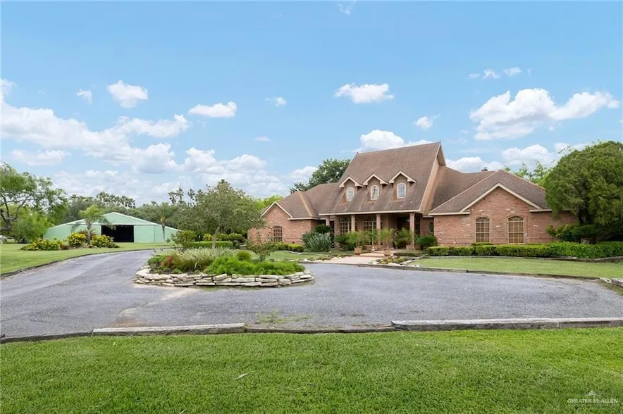 Custom built home on 2.95 acres situated on a large lush resaca. Enter into the spacious liing room with over 20 ft. ceilings. Bedrooms boast vaulted ceilings, the primary suite includes cedar lined closets and a small adjacent office. The remodeled kitchen and breakfast are adjacent to the laundry room and just a few steps from the 2 car garage which includes a guest bedroom with full bath. Upstairs are two large bedrooms sharing a full bath. Outside, a covered patio with a water feature, an enclosed 52" TV area with a built in bar and a fire pit creating an inviting outdoor space. Lush landscaping attracts local wildlife. On the west side of the home a 90'x60' barn with a new roof and fresh paint offers ample storage. This thoughtfully designed home blends luxury, and perfect charm for comfortable living.