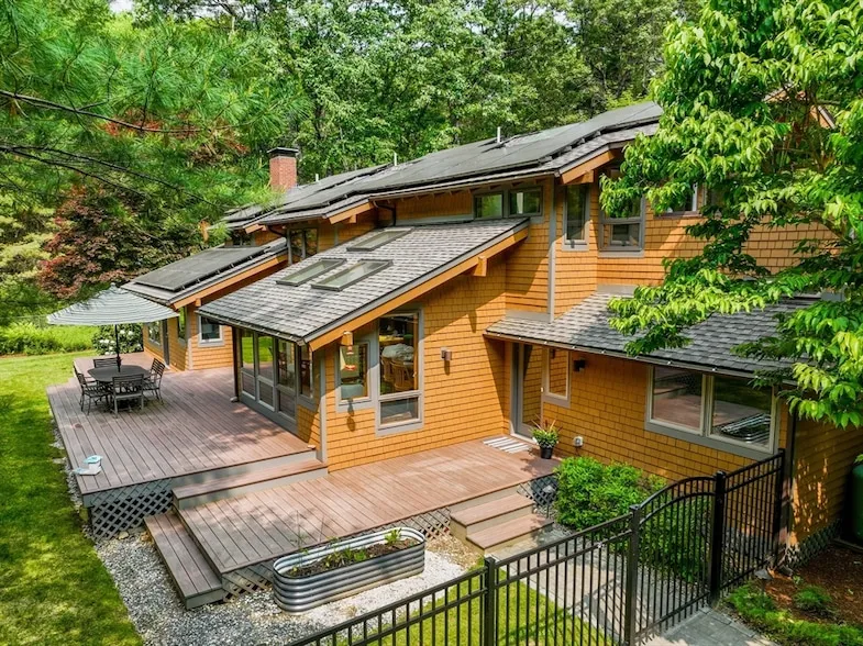 Beautifully updated & expanded contemporary home on nearly 3 acres offers privacy, energy efficiency & a flexible layout designed for modern living. Abundant windows, skylights & vaulted ceilings in the entry & FR fill the space w/natural light. The chef s kitchen flows to a breakfast area & seating nook overlooking the woods, w/access to the deck & fenced backyard perfect for indoor-outdoor living. The FR features a wood-burning FP & tranquil views. The 1st floor also includes radiant heated floors, 2 offices, an en-suite BR, stylish 1 2 bath, mudroom & laundry. Upstairs, the private primary suite offers a walk-in closet, renovated bath & private deck. Two additional BRs share a refreshed full bath. The LL includes a spacious rec room & generous storage. Geothermal heating/cooling, solar panels & thoughtful design throughout. Located on a shared private drive near trails, conservation l...