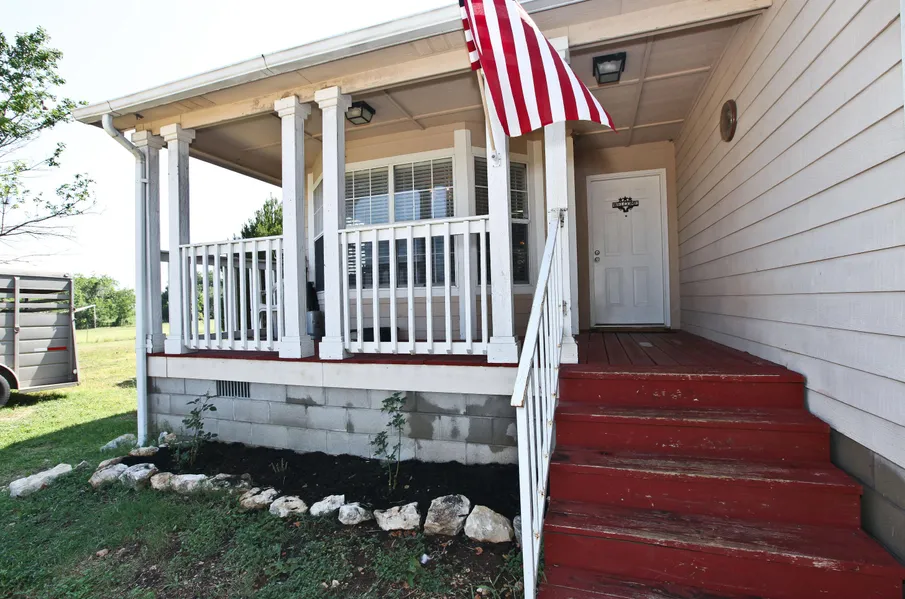 Adorable country home on 2.99 acres. 3 large bedrooms; ceiling fans, 2 bathrooms & 2 dining areas. Beautiful hardwood flooring in family room, dining room, entry & hall way. Gourmet kitchen w/ stained oak wood cabinets & st st double ovens. Tile in all wet areas (including breakfast area) & carpet in the bedrooms. Front & back covered porches. Fenced in yard for pets away from livestock. Livestock fencing, storage buildings and a 2 stall run-in shed for horses. Wood floors, tile, fresh paint 2012/2013.