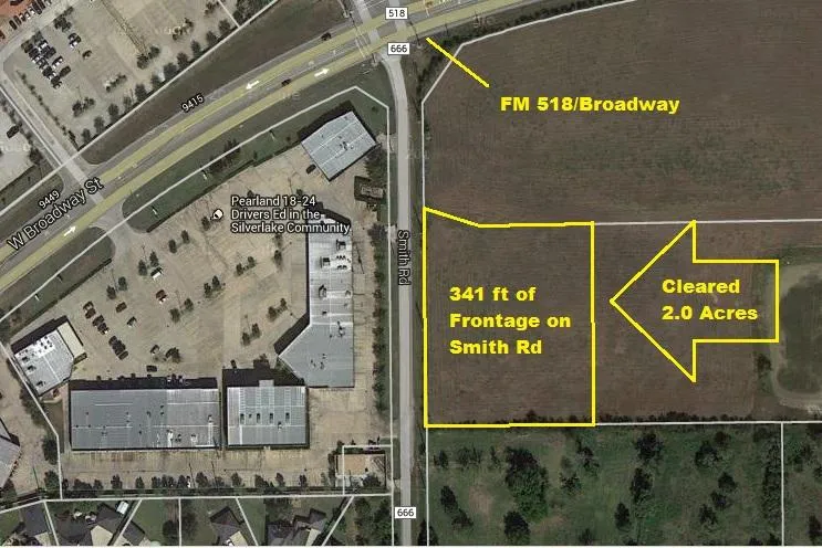 Major Price Reduction! Great Price with Prime Location in the Heart of Fast Growing Pearland. Cleared 2.0 Acre Commercial Lot with 341 Feet of Frontage on Smith Rd near FM 518/Broadway St. Surrounded by Commercial Businesses & Residential Communities. Lots of possibilities for this 2-Acre Tract: Medical Center, Professional Building, Hotel/Motel, Retail Center, Day Care Facility, etc.! Quick Commute to Medical Center and Houston via FM 518, TX-288 & Beltway 8! Seller also has a Quality Inn Franchise available for $30,000. Come See it Today!