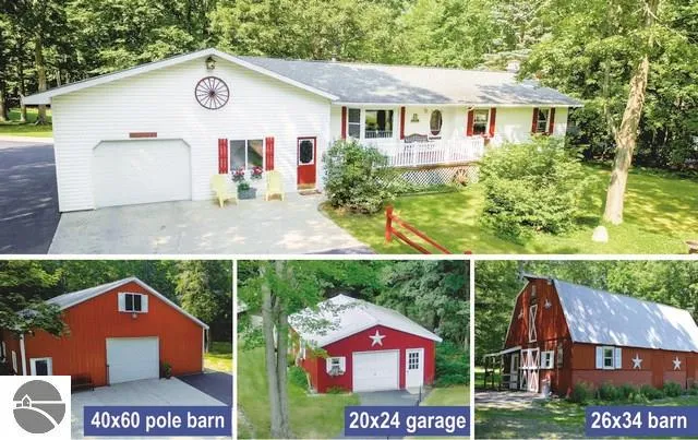 QUINTESSENTIAL GENTLEMAN'S FARM! Nestled between Long Lake & Lake Ann, this one-of-a-kind setting is rarely offered. Two acres of beautifully landscaped grounds host floral gardens, fruit trees, fish pond, covered deck, screened patio, 2-story pole barn, animal barn, detached garage, storage building & chicken coop all accessed by winding paved drives. The storybook farmhouse is outfitted with quaint charms found in knotty pine accents, built-in bookcases, glass door cabinets & hardwood flooring. This is your once in a lifetime opportunity to find an affordable farm within minutes of Traverse City!