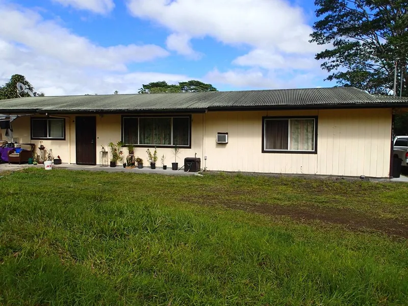 CHARMING 3 BEDROOM 2 3/4 BATH HOME. DESIRABLE FLOOR PLAN WITH A SPACIOUS LIVING ROOM AND DINING AREA. MASTER BEDROOM HAS AN ATTACHED BATH. THE OTHER TWO BEDROOMS ARE SERVICED BY AND ADDITIONAL BATHROOM. THERE IS A 3/4 BATH OFF THE KITCHEN AREA. GARAGE WAS PREVIOUSLY ENCLOSED FOR TWO ADDITIONAL ROOMS AND EXTRA LIVING SPACE. . FRONT OF THE PROPERTY IS FENCED FOR PRIVACY. NICE TALL NATIVE OHIA TREES. HUGE BACK YARD READY TO PLANT YOUR ORCHARD AND GROW YOUR GARDEN. LARGE CATCHMENT TANK HAS A NEW LINER. HOME SWEET HOME! CONVENIENTLY LOCATED NEAR ORCHIDLAND SHOPPING CENTER , GAS STATION AND KALEO'S RESTAURANT.