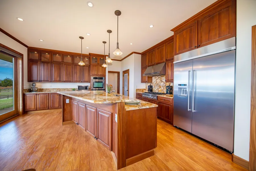 Custom built, large executive home with garage parking for 5 cars located in the perfect climate of Kula. Take advantage of all that upcountry Maui has to offer and be near Waldorf School. Enjoy big bicoastal ocean views and panoramic sunrises and sunsets from one of your 3 quiet lanais, while listening to the grass grow, or simply gaze at the views from inside this delight of a home. No detail was spared in the construction of this well maintained, turn-key estate. Soaring ceilings and solid Sapele mahogany 8' double entry doors, interior doors, all trim, moldings, casings and curved banister. Travertine floors in all bathrooms, 2 fireplaces, smooth interior walls, Thermadore 6-burner gas range and lpe wood outdoor railings and garage door frame. Luxurious primary bath with a 6' foot long soaking tub and expansive walk-in closet with mahogany shelving throughout. The entire 2 acre prope...