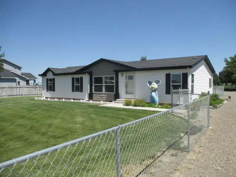 Very well maintained 3 bedroom, 2 bath manufactured home on permanent foundation. Has been declared real property. Home has vinyl siding, a new roof, metal soffit and fascia and rain gutter. It has a spacious enclosed porch and a 3 car garage with additional workshop area. The front yard is fenced and irrigation water is available. One acre is currently in irrigated alfalfa. It is close to town and very attractive.