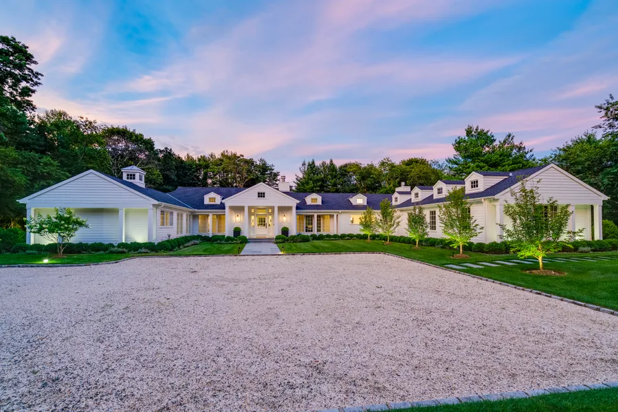 This Hampton-style residence embraces the best of modern design juxtaposed with classic elements. Completely renovated in 2021 with no expense spared. Beautifully set on two acres of specimen trees and lush green lawns, the five bedroom ranch is approached by a gravel drive that arrives at a wide landscaped forecourt and inviting entry. Sophisticated updates include new windows and doors, new roof, new marble flooring, new kitchen and all new bathrooms. Rooms are bathed in natural light with vaulted ceilings adding volume and interest. Crisp white cabinetry, top appliances and a generous island are for the chef of the house. Off the kitchen, the stylish den features a fireplace and custom built ins. The dramatic beamed great room highlights custom built-in shelving, bar and a gas-fueled mantled fireplace. An elegant dining room is the perfect setting for entertaining. Primary suite opens...