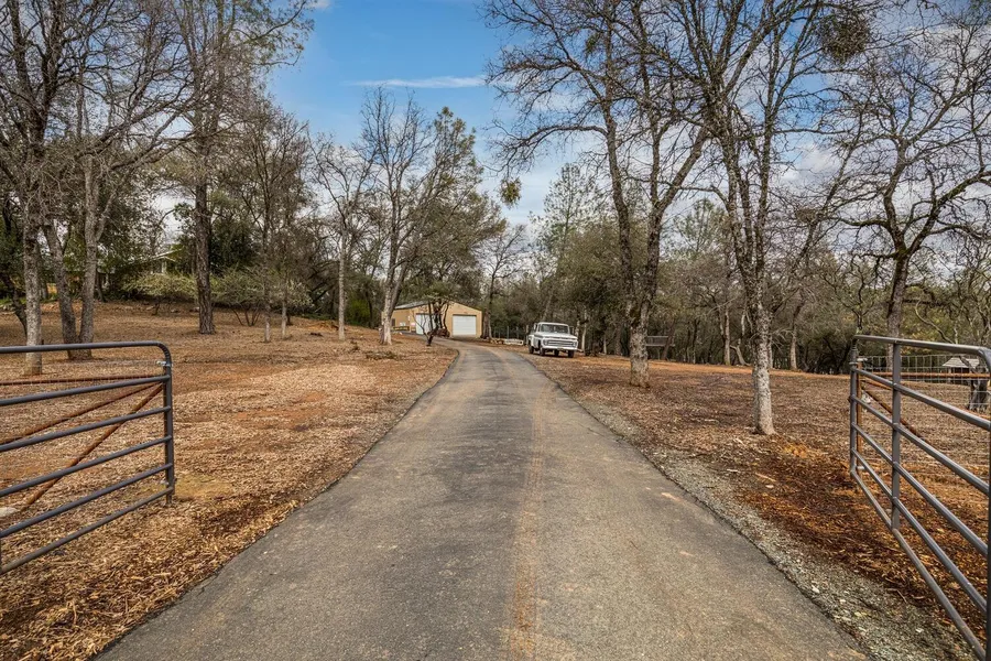 Studded with oaks, cedars, and pines, this home is situated on 2 peaceful acres in a country setting and features 3 bedrooms and 2 full bathrooms plus a room ideal for a 4th bedroom, office, or hobby room. The usable 2-acre parcel is completely fenced w/ vehicle gates at ingress and egress of the blacktop circle driveway. Attached 2 car garage plus a 1200 sq ft shop (w/ 14' doors, 17' height at the gables, 110v and 220v outlets), so bring all your toys and the RV. Meandering inside, the kitchen is adorned with granite and butcher block counters, exposed brick, double oven, and instant hot water. The master bathroom has heated floors (yes!) and a jetted bathtub. The family room showcases a stone fireplace with pellet insert and custom mantel. Upgraded interior doors and hardware, updated lighting, and crown molding. Owned Solar and Free Water from Dry Creek! Central heat/air, dual pane windows, R-50 attic insulation, whole house fan, newer hot water heater and reverse osmosis water purifying system! 2 wells w/ 1500 gallon holding tank in ground. This property has all you desire with county living but is only 5 minutes from all the conveniences you need for a simple life such as restaurants, breweries, golf courses, schools, walking/riding trails, and shopping.