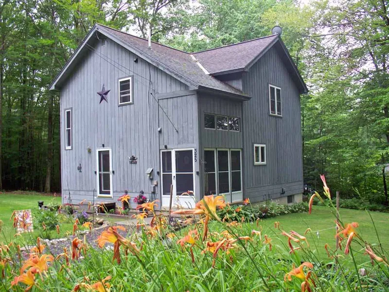 You will find this immaculate, stylish Contemporary style home on 1.97 acres that is protected by lush greenery, floral gardens, all manicured to mirror a park like setting. Unique design, with the central living area being open, revealing beams and wood ceiling. Beautifully equipped kitchen w. breakfast bar that takes in the views of the living room and dining room. The living room has a corner hearth with pellet stove and has access to the rear deck with power awning. The bedrooms are very spacious and well appointed, updated bathrooms, lower level family room and inviting screen room complete the layout of this interesting home. The large detached 2 bay heated garage, offers a large workshop, wood stove, wood shed and second floor access. This is a pleasure to show and will not disappoint. Easement for adjoining property.