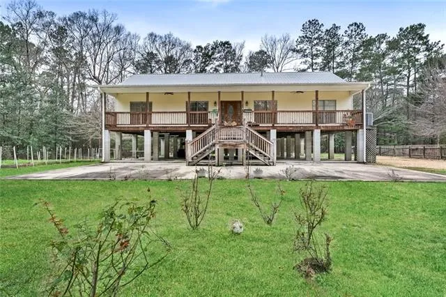 Lovely home on 2 acres great for entertaining with covered porch across the entire front of the house as well as a screened in back porch. Cathedral ceilings in the open living, dining, and kitchen with lots of natural light. SS appliances, custom, cypress cabinets; ample storage space. Master with tub, separate shower, and large closet. Home is raised with full slab underneath allowing for covered parking or more space to entertain. Vegetable gardens, landscaping, and plenty of tree remain for privacy.