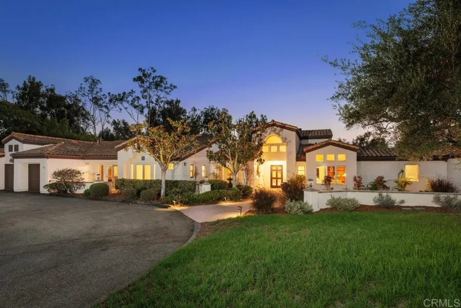 Your search for the ultimate country estate will end at this luxurious residence in Olivenhain, where expansive grounds and equally impressive interior living spaces provide an unparalleled environment for preferred living. A gorgeous corner homesite on 2 acres enhances privacy and beauty, with meandering trails and mature landscaping joining a resort-caliber pool and spa. Entertain impressively at the built-in poolside BBQ bar, relax by the stunning custom fireplace, or socialize on the spacious loggia. Extending approx. 3,538 s.f. over one sprawling level, the 4-bedroom, 3.5-bath residence easily caters to both daily living and unforgettable entertaining. A large island anchors the kitchen and complements handsome wood cabinetry with glass uppers, two garden windows, a breakfast nook, granite countertops with full backsplash, and high-end stainless steel appliances including a built-in refrigerator. Dramatic architecture, fresh paint, new carpet, tile flooring, and a 3-car garage are also featured. A detached office makes a great studio or workshop, and the luxe primary suite displays a fireplace, a sitting area with bay window, a walk-in closet, dual vanities, a soaking tub, separate shower and a curved glass window.