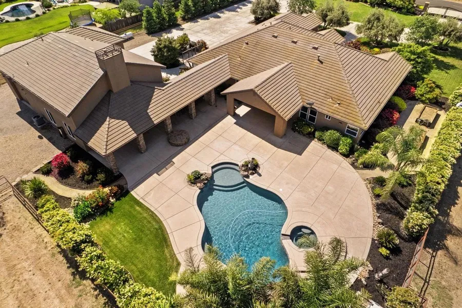This luxurious home of 3,548 sf, has 5 possible bedrooms, office, and great room. The kitchen features a dining bar and breakfast nook, the convenience of a huge laundry room and extra mudroom. On 2 acres you can entertain in style with an outdoor kitchen, with 44'' grill with rotisserie, dual side burner, wine refrigerator, beverage refrigerator, stainless cooler box, and ample storage. For RV owners, there's a 42' by 22' enclosed storage or shop with 14'x12' doors, providing access to the pool house/game room/man cave. The Pebble Tech pool and spa, with a custom rock waterfall, offer a luxurious retreat. The property includes your own red barn for storage or livestock equipment, covered paddocks, pipe fencing, auto waterers, and large pipe-fenced pastures, making it ideal for horses or livestock. Front wrought iron and stone fencing with two automatic gates ensures privacy and security...