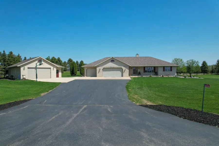 Sprawling Ranch on 2 acres with a secondary 32X48 heated garage! As you approach the home the cover porch greets you and is perfect to watch the sunsets! Step inside with the foyer greeting you that flows into your updated kitchen with granite counter tops & snack bar. Open concept from the kitchen to the dining area and living rm with cathedral ceiling with a gas fireplace. The 4-season room has beautiful views of your private yard and features a deck & patio area with a firepit for all your entertainment. Primary Bedrm offers a walk in closet and private bath. 2 other ample sized bedrms has the main bath nestled between them. 1st fl laundry has a door to the backyard. Oversized 3 car attached garage has an epoxy fl , bath! L.L family rm, bar area, game area, exercise rm, 3rd full BA.