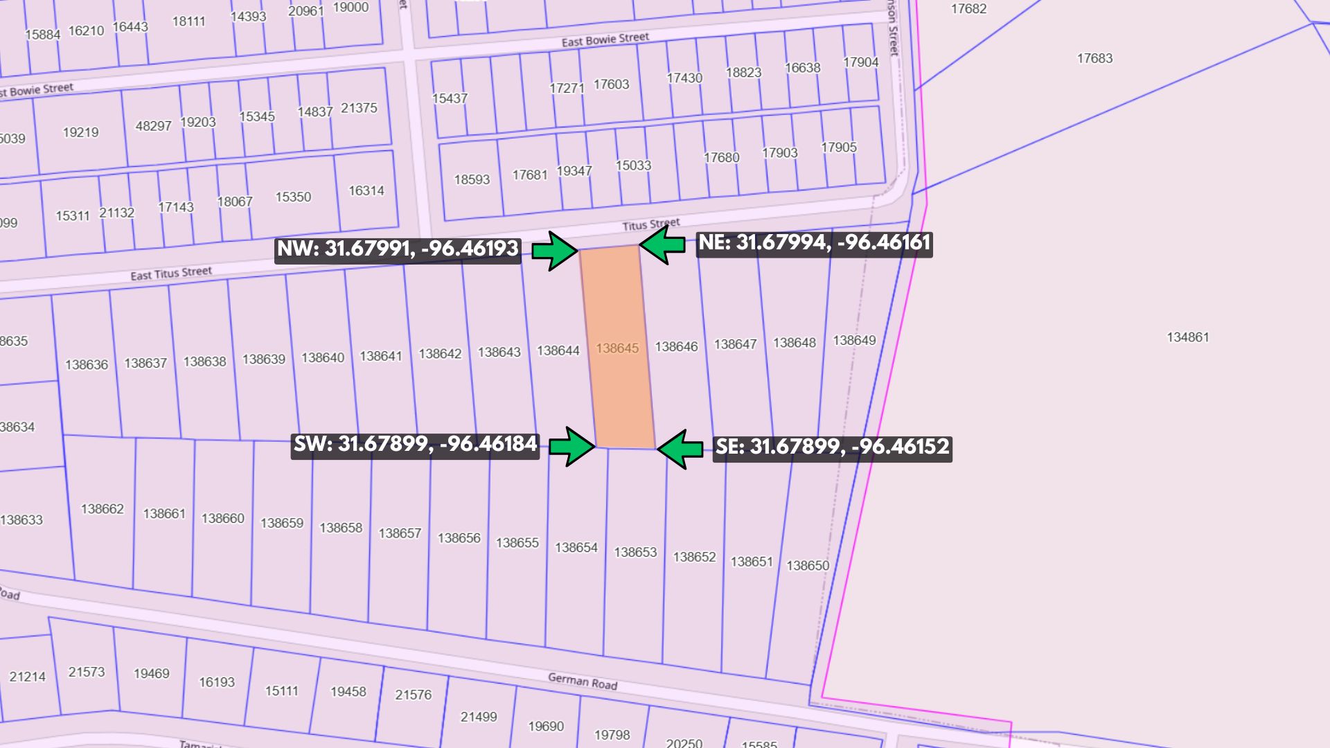 To visit this 2-Bedroom Modular Home in Mexia TX, search 1308 East Titus Street, Mexia, Texas, 76667 within Limestone County on your phone. When you are near the land, search 31.67991, -96.46193 on Google Map to locate one of the corners. Contact our office for surveys (if available), county plat maps, Google Map boundaries and corners, and MapRight.