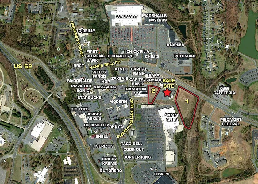 Tract 1 consists of 5.3 acres with 2.84 acres of buildable area. The street address is 375 Hanes Mill Road, Winston-Salem, NC. This prime location across from the Hanes Mill Walmart with a tax assessed value of $1,181,700, will sell ABSOLUTE to the highest bidder regardless of price.