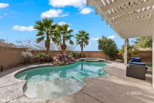 "YOUR OWN RESORT"... POOL - SPA - VACATION RENTAL APPROVED ! RV PARKING on your OWN LOT !!! FASCINATING property - UNIQUE opportunity. FULLY FURNISHED - TURN KEY. North of interstate 15 you can pull your motorhome right next to your home. Park it - close your custom wrought iron gate. Walk in your home. No need for RV garage. No need to pay storage fees for your RV. Fully contained with 5' block wall that surrounds the property. Let's talk about the home. Stunning two story home. Fantastic floor plan. All bedrooms are upstairs. Main level is for entertaining and relaxing. Beautifully designed custom pool with built-in spa has incredible storybook waterfall that cascades into the pool. Palm trees accent this pool creating an "OASIS IN THE DESERT". Main bedroom suite offers unforgettable balcony that looks out across the valley and down to the pool area. Spiral outdo...