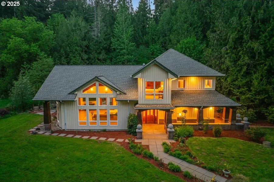 Welcome to your private oasis on over 6 peaceful acres. This custom-designed 6,141 sq ft estate offers a luxurious blend of elegance, comfort, and functionality. Inside, you’ll find expansive living areas with soaring ceilings, a beautifully designed chef’s kitchen, and a separate wing featuring a full second kitchen—ideal for multigenerational living or entertaining guests. An oversized wood-burning sauna provides the perfect retreat for relaxation. The hardwood floors beautifully reclaimed from the high school basketball court shine throughout. The beautiful wood ceilings throughout were crafted from timber harvested from the property itself, adding a personal touch to the design. The primary suite is thoughtfully designed with fine custom finishes, indirect lighting, and large windows that flood the space with natural light. The attached en-suite bathroom includes a fully tiled walk-in shower, dual vanities, and upscale lighting throughout. Designed by an architect, the home is built with acoustics in mind and maximizes the use of natural light and flow. Step outside onto a sprawling deck where you’ll find a covered lounge area equipped with ambient lighting, television access, and a large hot tub—perfect for year-round enjoyment. The property includes a tranquil fish pond and wooded surroundings, creating a true park-like setting with privacy and beauty. For hobbyists or business owners, the 3,400 sq ft two-story garage/shop is fully wired and ready to handle all your storage, workshop, or creative needs. Whether you're looking for a personal retreat, a place to entertain, or a multifunctional property, this home offers unmatched flexibility and timeless design in a serene setting. Entering the property via a private road, the home site is surrounded by old the growth forest providing year round privacy, yet only minutes from PDX. There has been over 20+ upgrades/updates to this property! Please view the downloadable feature sheet that includes all the information