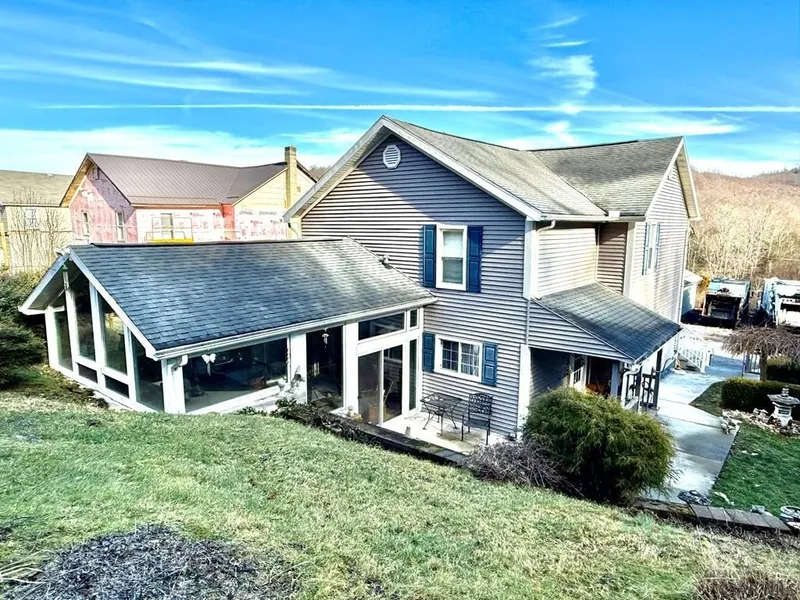 Very large & unique 2-story home located at end of no-thru street offering privacy & space rarely found at this price point. The home provides over 2,100 sq ft of finished heated living space + add'l rooms used daily but not included in square footage due to lack of heat. 2 parcels included: the homesite plus 3.54 acres across street mostly wooded & steep offering natural surroundings. Exterior features include vinyl siding, large composite front porch, glass double entry doors, side patio w/concrete pavers, meticulous landscaping & one-car covered carport. Across the street is a detached 2 car garage (4 car tandem) with electric. The home features a 30 x 12 living room with double-sided propane fireplace, formal dining room, kitchen w/abundant cabinetry & walk-in pantry, 2nd family room w/stunning custom architectural window, office w/exterior entrance, powder room & large addition w/c...