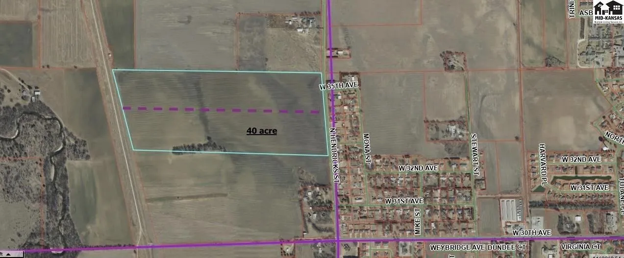 Want to have the space of living in the country, but adjacent to the Hutchinson city limits, then here is your building site. Seller is offering this N Hendricks Street 77 +/- parcel with two options. Option 1: $250,000 for the south 40 acres & buyer/seller to split the cost of the survey. Or option 2: $375,000 for the whole 77 +/- acres. Buyer to confirm with Mark at Reno County Planning & Zoning, that the buyer of the 40 acres may again split that lot one time by filing a lot split application. Or if the whole 77 acres is purchased the buyer may also have one lot split by filing a lot split application. Electrical lines running along the road are Evergy. The levee to the west of the property means the property is certified protected so it is not in a floodplain. Great north location with crossroads being 30th Ave to the south and W 43th Ave to the north.