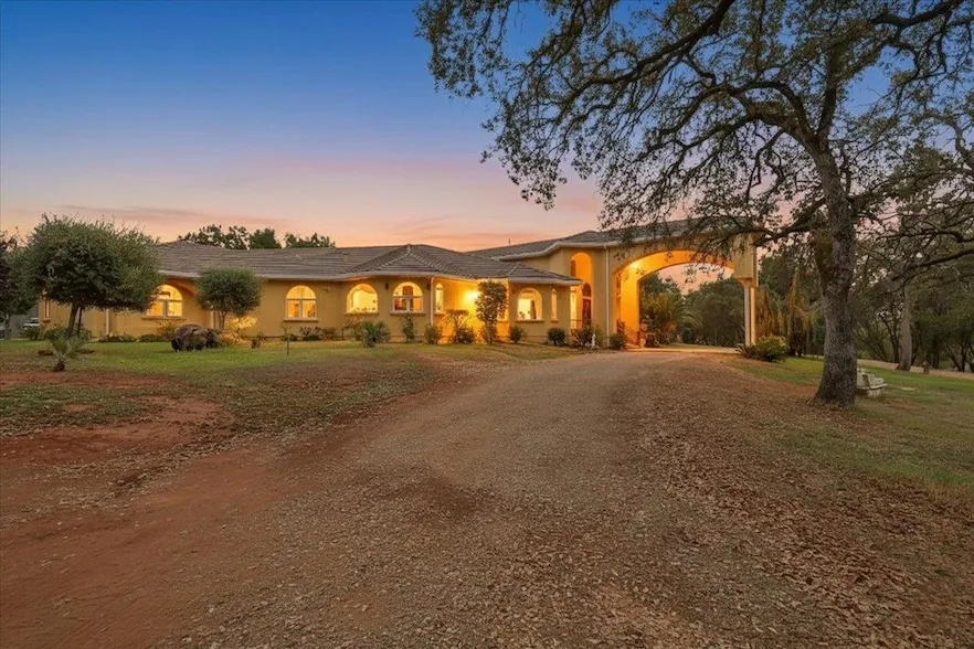 Discover the perfect blend of country beauty & modern comfort in this stunning 6bds, 5ba, 6,106sqft custom estate. Thoughtfully designed for energy efficiency, this property comes w/fully paid solar, three newer A/C units, tankless water heaters, & BVID irrigation. Step inside to an open floor plan that includes an elegant formal living room & three separate family areastwo with cozy fireplaces. The luxurious primary suite features a private sitting area & a spa-like retreat bath w/walk-in shower, dual sinks, & walk-in closet. Entertaining is effortless in the chef-inspired gourmet kitchen, complete w/a commercial-grade gas stove, refrigerator, built-in microwave, dishwasher, spacious island w/sink, dining bar, & plenty of cabinetry. A private bar w/sink and an impressive formal dining room w/its own fireplace & panoramic hill views make gatherings unforgettable. Additional highlights include recessed lighting, ceiling fans, tile flooring, extra-wide hallways, abundant storage, and a 4-car garage. Outdoors, you'll find an oversized covered patio w/fans, perfect for hosting, plus RV parking, a chicken coop, and a 52' x 42' shop w/roll-up doors & electricity. Set on a peaceful property just minutes from Collins Lake, this estate offers spectacular views & serene sounds of nature.