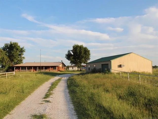 Muskogee Ranch Home with 20 acres, detached garage with living quarters, barn and multiple other outbuildings. This home has a lot of potential, large covered front porch, fenced and well house. Home is sold "as-is".