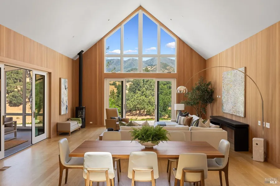 Just beyond the gate, a winding drive leads you to where the world opens up Mount St. Helena rising in the distance, vineyards in the valley below, and light dancing across 20+ acres of unspoiled land. Here, a newly completed modern farmhouse invites you to slow down, stretch out, and savor the rhythm of Wine Country living. Wake to sunrises framed by the soaring windows, spend golden afternoons beneath towering trees, and entertain effortlessly in the sunroom overlooking the pool. Every space is beautifully designed to connect you to the land thoughtfully built with modern style, warmth, and quality. The separate 1BD/1BA suite with a kitchenette offers comfort for visitors, while open acreage awaits vines, horses, gardens, sports courts, and anything you can envision. Secluded yet minutes to Calistoga's vibrant downtown, the 3,903 sq ft main home includes 3 BD/3 BA, and an open layout filled with light. Vaulted ceilings, custom paneling, wide plank floors, and soaring windows distinguish the great room, while the chef's kitchen includes Wolf and SubZero appliances, and a patio for dining al fresCo. The primary suite has panoramic views, a spa-like bath, and a large walk-in closet. This is more than a home it's a quality of life rooted in nature, beauty, and possibility.