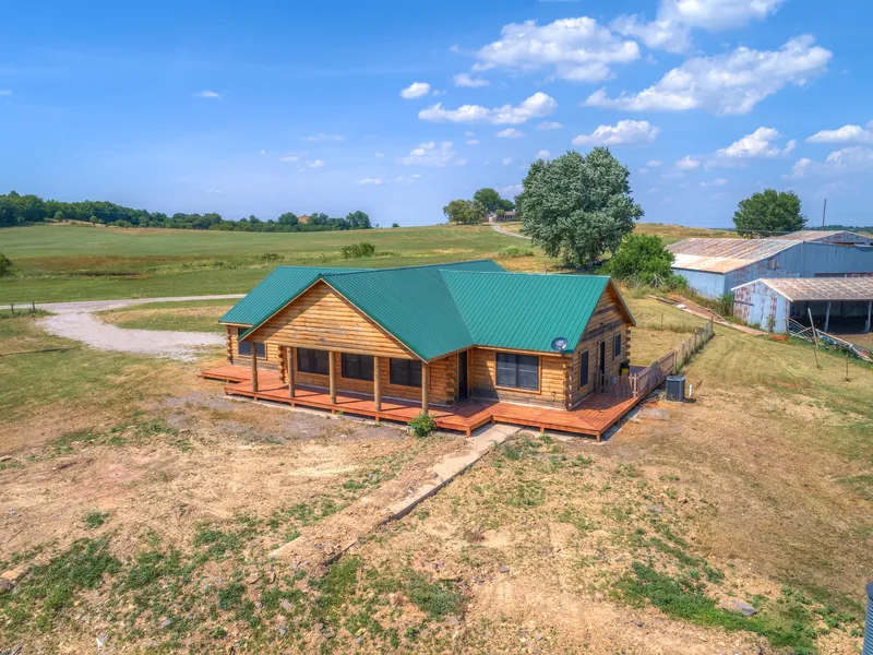 Picturesque Log-Cabin With 20 Acres Ideally Located on 305th/Ben Lumpkin! Newly Constructed in 2018, This Home Features Vaulted Ceilings, Large Windows With Tons of Natural Light, a Cozy Fireplace, and a Wrap-Around Porch to Enjoy Future Scenic Views. Handicap Accessible With Ramped Entry and Modified Bathroom With Large Walk-In Shower. Land Features a Corral Area For Cattle/Horses, Several Ponds, and 6+ Outbuildings (Barns/ Shops /Lean-Tos, etc). Comes With Unfinished Underground Bunker/Storm Shelter. Selling As-Is.