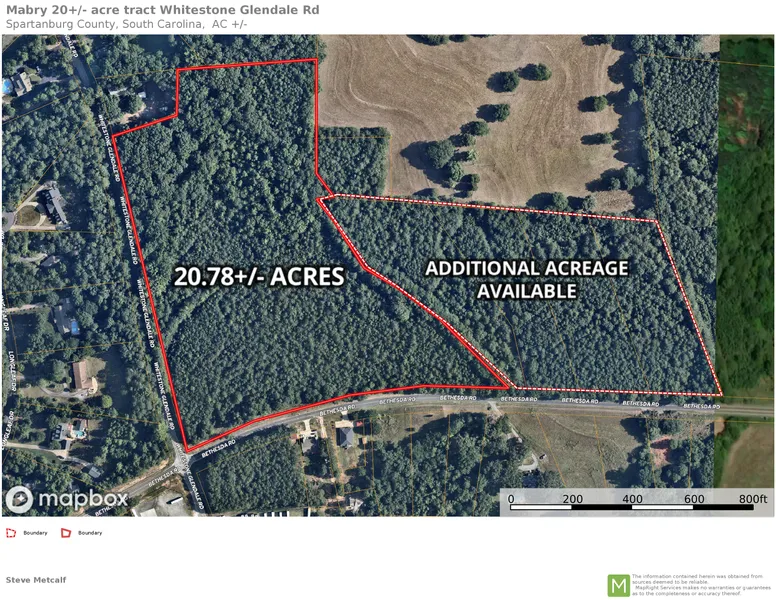 Prime 20.78+/- ace tract fronting on both Bethesda Road and Whitestone Glendale Road. Tons of road frontage for plenty of possibilities. Topography is mostly level and tract is heavily wooded. This 20 acre tract is located in Spartanburg District 7. Perfect opportunity for development or a private estate. Adjoining 13+ acres also available. Contact Jewel Busch at (864) 580-1215.