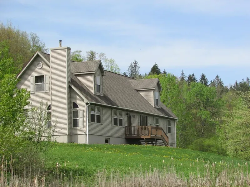 This 5 BR home sits on over 20 beautiful acres and borders state land. 10 Minutes to Oquaga State Park. Two car Garage with workshop, Large open floor plan with oak kitchen, large island, 1st fl laundry,gleaming hardwood floors, master suite with whirlpool tub, large spacious rooms with beautiful views all around. Spring fed pond full of fish, beautiful year round home or seasonal getaway!