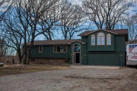 4 BR, 3 BA home nestled amongst 20.92 acres m/l has features the whole family will love! This split level home has master bedroom with walk in closet & private bath featuring walk in shower with duel shower heads and continuous hot water; updated kitchen with roll out shelving; glass sun room with prefect view of the pond, gas fireplace, & access to the large rear deck; spacious living room with large picture window; finished lower level with non-conforming bedroom, 3/4 bath, & family room with new hardwood flooring, wood burning fireplace, & walk out basement; oversized attached 2 stall garage; & included ADT Security System. Enjoy the great outdoors with tree lined spring feed pond (app. 2.4 acres) with dock, sandy beach, & maintained walking path; spacious deck, partially heated 3 stall detached shop with dry room storage; numerous wildlife including deer and pheasants can be found in...