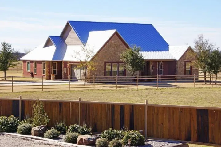 The all steel horse barn is 45x85 with a cave stone, siding, & corrugated metal exterior. 3 roll up doors, 3