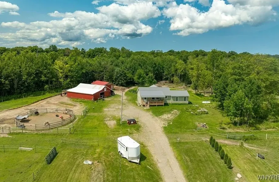 This 20+/- acre property in Chautauqua County offers a remodeled ranch home, barns, pastures, fencing, and a pond. Recent updates include roof, siding, heating, cooling, septic, and well pump. The barn features stalls, a tack room, hay storage, and run-in areas, making it ideal for horses or livestock. Trails run throughout the acreage, connecting to snowmobile and riding trails. A garage, chicken coop, and hunting stand complete the property’s versatile setup.